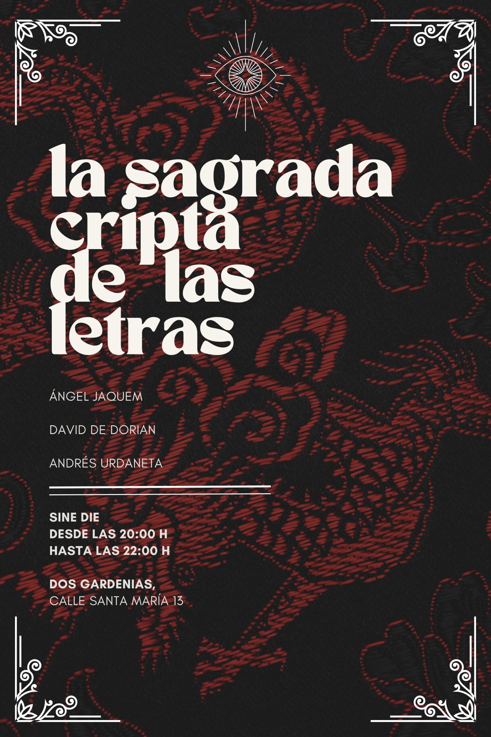 IDEOLOGÍA: Tertulia literaria que Ángel Jaquem organiza en el bar Dos Gardenias, ubicado en la calle Santa María de Madrid, dentro del barrio de las letras. Esta tertulia tiene lugar subrepticiamente por la noche y con pocas horas de aviso, sin un patrón claro que pueda ser rastreado. El sobrenombre de «Sagrada Cripta» se debe a que la tertulia se realiza en un lugar anacrónico, oscuro y que pronto pertenecerá a las catacumbas de la ciudad. La tertulia atrae a intelectuales, artistas y desamparados sociales de la época, convirtiéndose en uno de los encuentros poéticos menos conocidos de Madrid. La tertulia del Dos Gardenias es un importante centro de reunión para la vanguardia poética española, donde se gestan ideas, delirios y se comparten experiencias entre algunos de los nombres menos relevantes del momento.